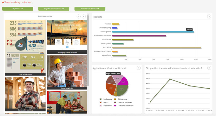 Perhaps everyone needs, at a certain point, a document highlighting the most important program achievements organized in a friendly and easy to understand form, without intimidating tables. This specific need is addressed by our infographics-creation service, as users can request various formats for data visualization, each of which can be customized to serve the various management or communication purposes. We can help presenting the most relevant data in any shape, form or content type needed to demonstrate the impact of a project or program.